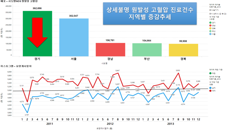 지역별 '상세불명 원발성 고혈압' 진료건수를 2008년부터 2013년까지 건강보험공단 빅데이터를 활용하여 분석해 보았습니다.